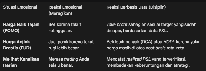 - Menghormati Rencana Take Profit: Saat harga melonjak (FOMO), data P&L yang jelas mengingatkan Anda pada target keuntungan yang telah ditetapkan. Anda cenderung tidak akan menahan aset terlalu lama (menghindari ketamakan) jika data menunjukkan bahwa Anda telah mencapai return yang sehat.