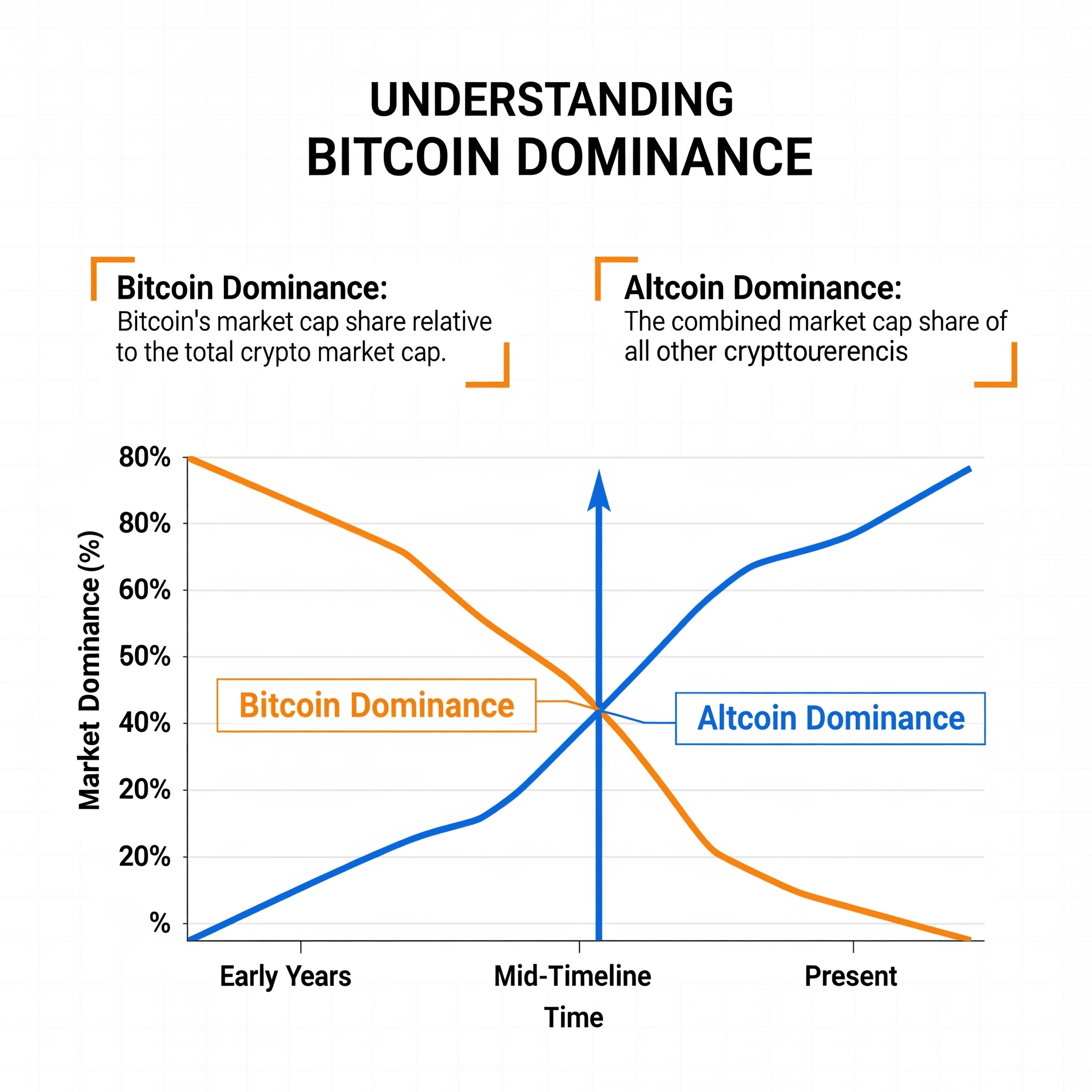 Ini adalah metrik yang paling penting. Dominasi Bitcoin mengukur persentase kapitalisasi pasar Bitcoin terhadap total kapitalisasi pasar seluruh aset kripto. Ketika BTC.D mulai menunjukkan tren menurun, itu artinya pangsa pasar altcoin secara kolektif sedang meningkat. Ini adalah sinyal kuat bahwa uang sedang berpindah dari Bitcoin ke altcoin.